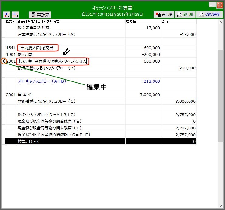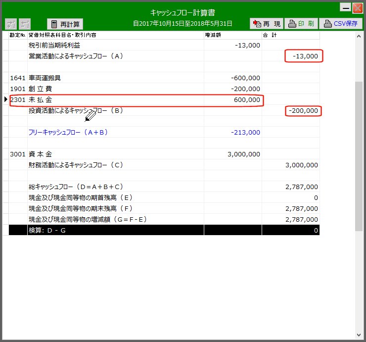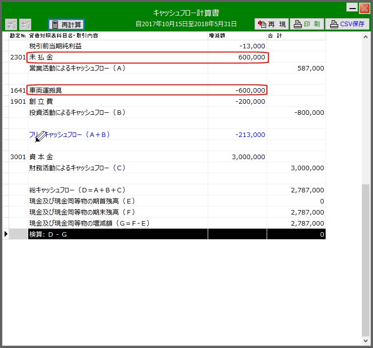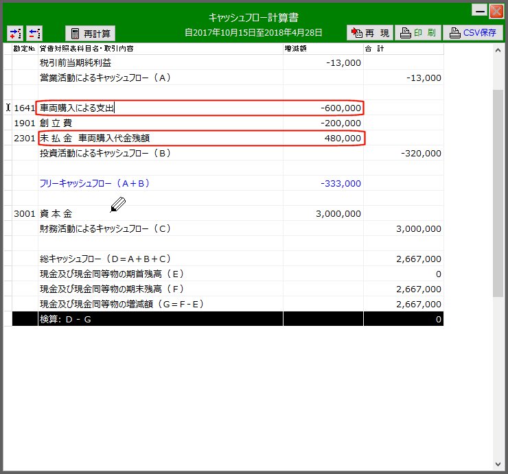 | その時点でのキャッシュフロー計算書(表示直後) | 「営業C/F」部の「未払金」は全額が車両購入にかかわるものなので「投資C/F」に属すべき事象です | ||