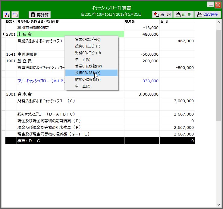 | 「未払金」の行にカーソルを当てマウスの副ボタンをクリックし ポップアップメニューの「投資CFに移動」をクリックします | |||