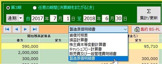 精算表の「製造原価明細書」をクリック