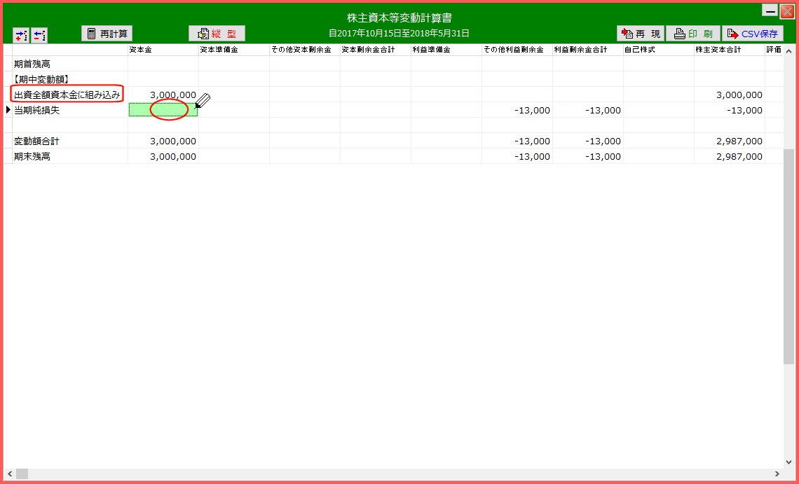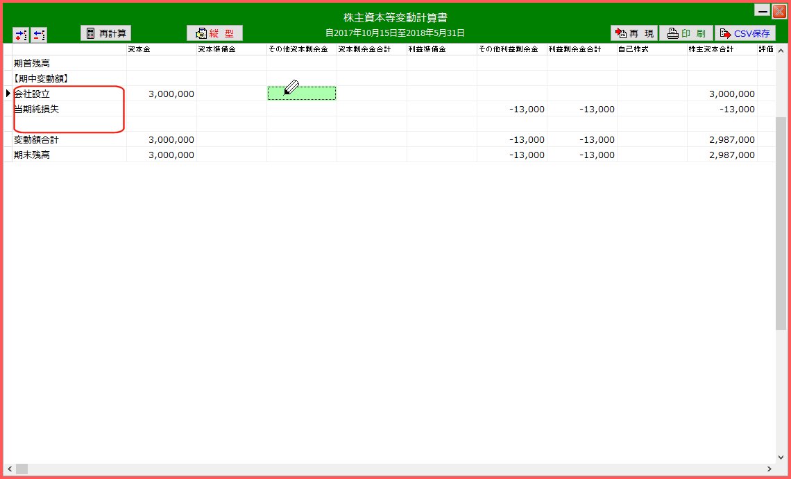 | 表上をクリックしたときに背景が緑になる欄は文字や数値の入力編集が可能なことを示しています 摘要欄(赤枠で示した部分)は仕訳処理時に入力された摘要文がそのまま 表示されます 長文になるときは適宜編集が必要になるかと思います 印刷時、40〜50文字が目安です 収まらない部分は切捨てになります 大元の仕訳レコードには何らの影響もありません | ||||||||||||