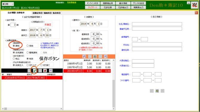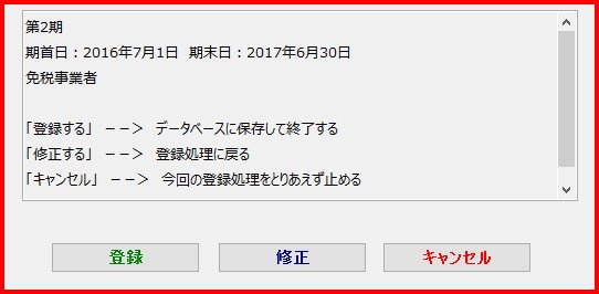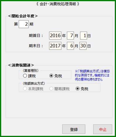 | 3. | 「会計期」入力ボックスに「2」、期首日、期末日を各入力、「業者種別」の「免税」ラジオボタンをクリックし最後に「登録」ボタンをクリックします | 「年」は「16」と入力して「Enter」キーを押下すると「2016」となります