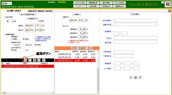 | 9. | 「会計期間・消費税」タブの「会計処理基礎情報」の「追加」ボタンをクリックします | |