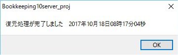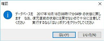 また、復元処理は慎重に行ってください 復元前には戻せません 復元すると結果的に最新のバックアップ日時から復元した時点の間のデータ(仕訳)は失われることになります |