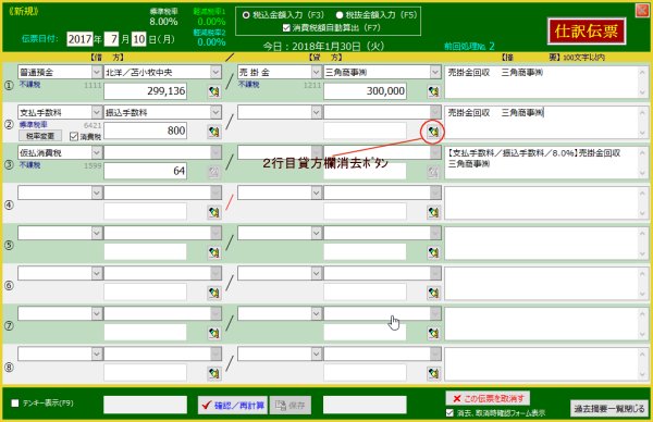 2行目貸方の「消去」ボタンをクリックして2行目貸方欄を消去し