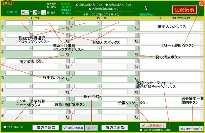 | F. | 「摘要」に適宜取引内容を記入します(100文字以内) | 借方あるいは貸方の補助科目名を摘要欄にコピーできます |