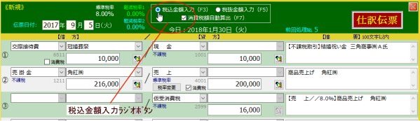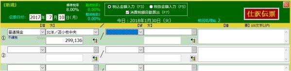 | F. | 2行目適宜摘要入力し「Enter」キー押下 続いて「税込金額入力」ラジオボタンをクリック(次の仕訳の準備-次の取引は「税込み」なので) |