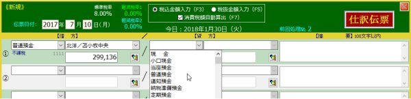 | @. | 日付を入力し借方総勘定科目ドロップダウンリストから「普通預金」を選択 | |