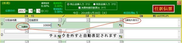 「消費税」チェックボックスのチェックをはずし 摘要に適宜文字入力します |