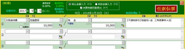 | @. | 1.日付を9月5日に変更し「交際接待費」-「冠婚葬祭」と選択します | |