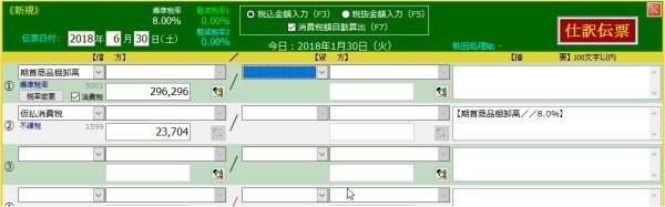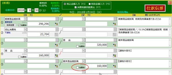 | @. | 期首商品棚卸高、但し前期は免税事業者だったので税抜き処理をします 日付を入力し借方総勘定科目ドロップダウンリストから「仕入」を選択 借方金額入力ボックスに「320000」と入力し「Enter 」キーを押下 |