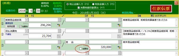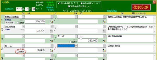 | A. | 3行目貸方で「商品」を選択し「消費税」のチェックを外します | ||