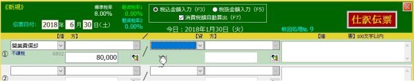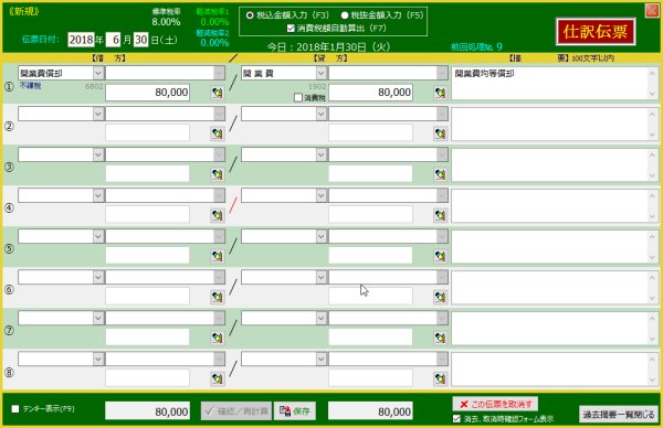 借方金額入力ボックスに「80000」と入力し「Enter 」キーを押下します |