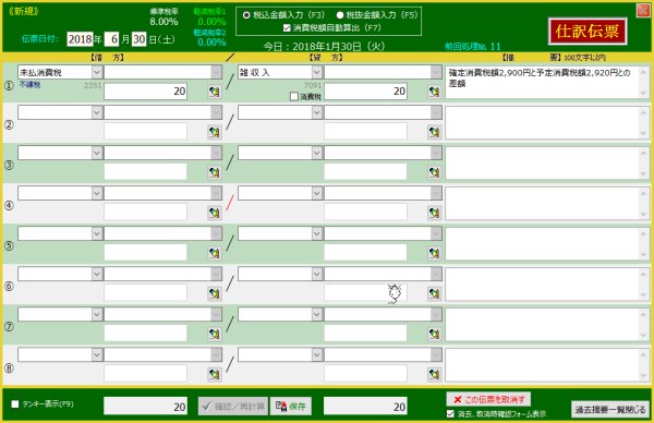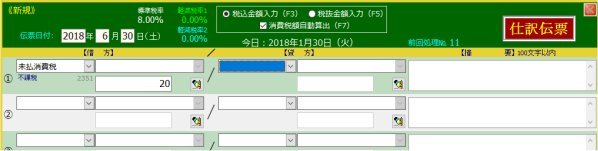 | @. | 1行目借方総勘定科目に「未払消費税」を選択し、金額欄に「20」と入力し「Enter」キーを押下します | |