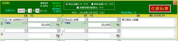 | @. | 1行目借方総勘定科目に「法人税・住民税及び事業税」を選択し