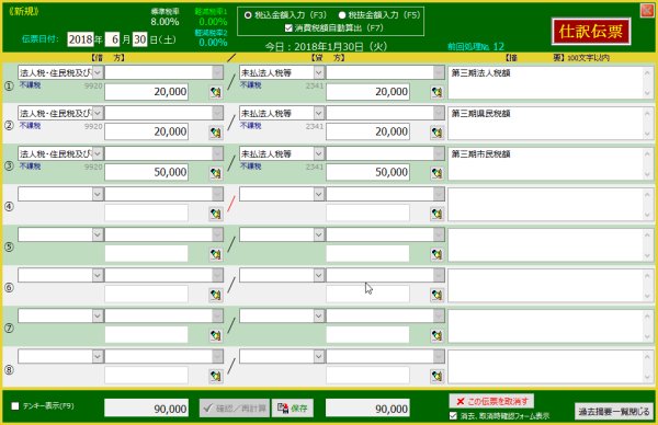 | A. | 1行目貸方総勘定科目に「未払法人税等」を選択し摘要欄に適宜文を入力します