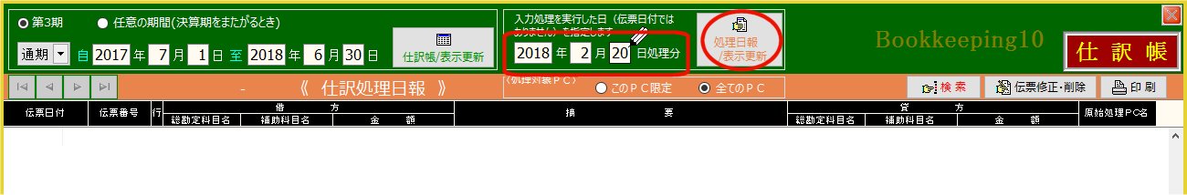 | 2. | 「処理日付」入力ボックスに新規に仕訳入力した日付(原始処理日)を入力し 「処理日報/表示更新」ボタンをクリック |