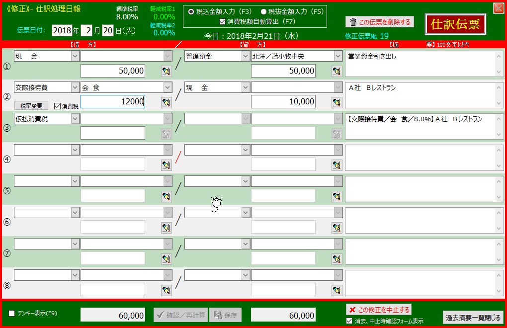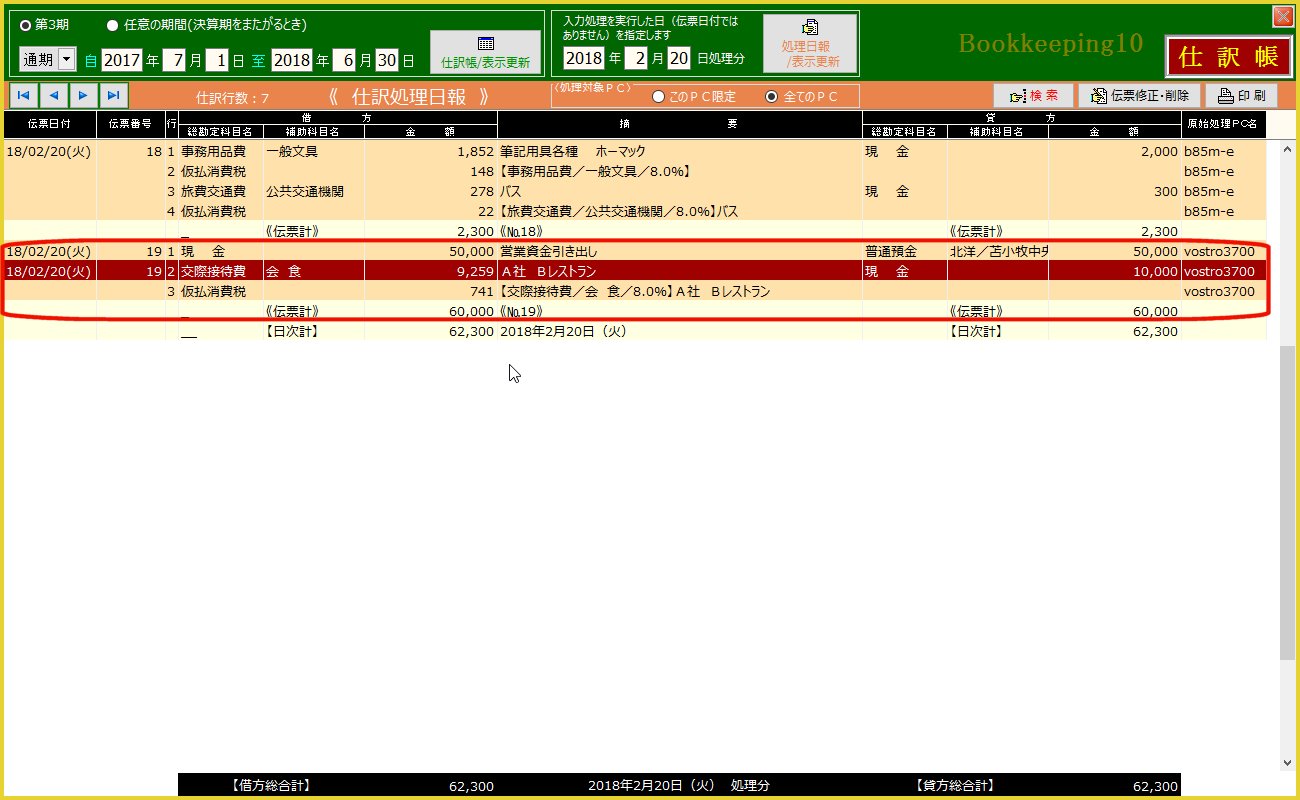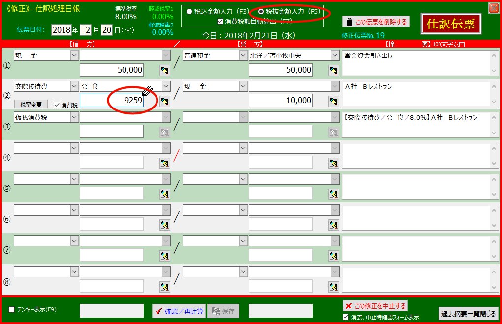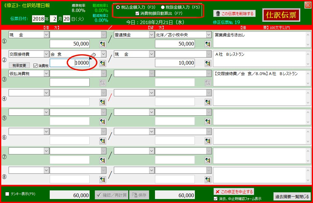 | 5. | 2行目「交際接待費」の借方金額欄をクリックします | 金額入力が「税込金額」になっているので「10000」になります