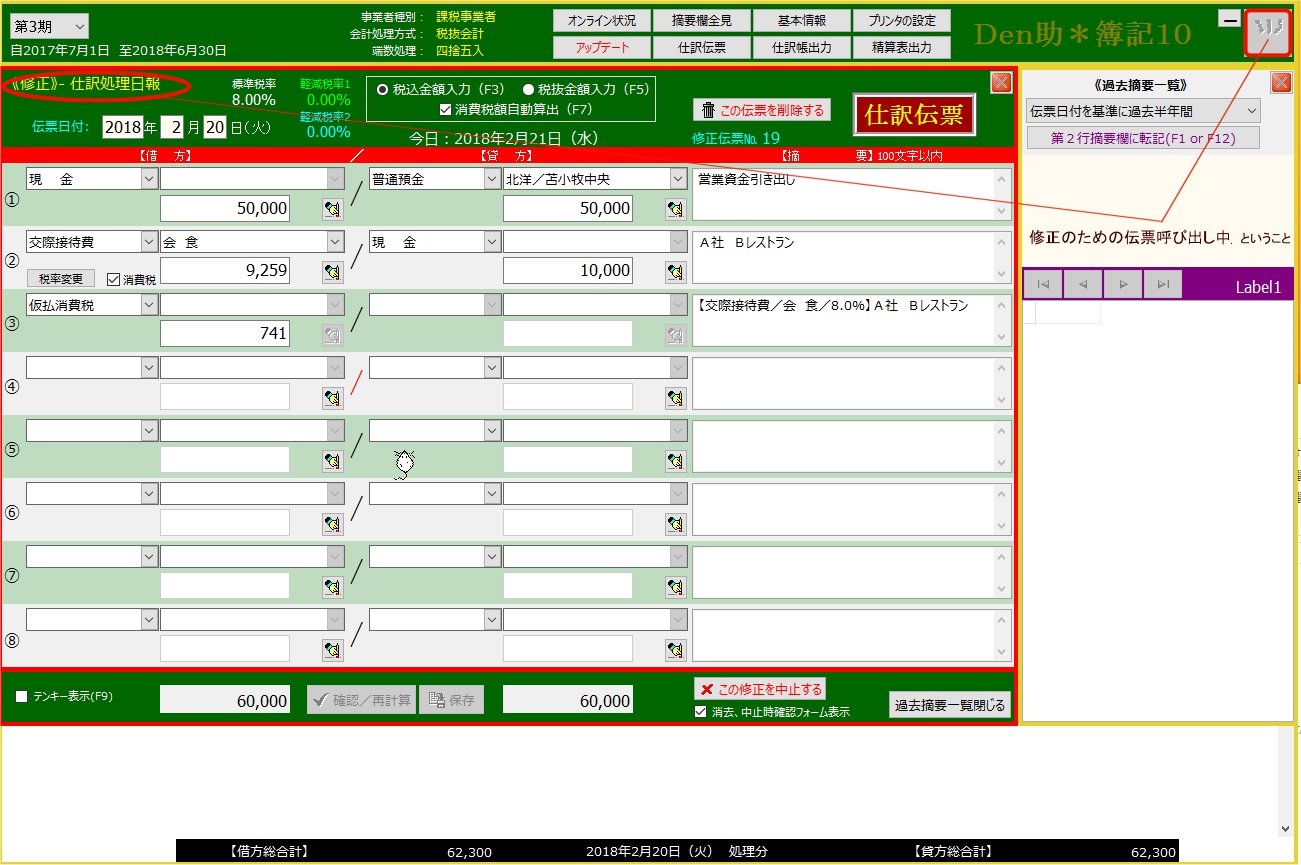 | 注意!! 修正のための仕訳伝票呼出中は他のフォーム(メインメニューフォームや精算表フォーム等々 仕訳伝票以外の全てのフォーム)は使えなくなっています | ||||