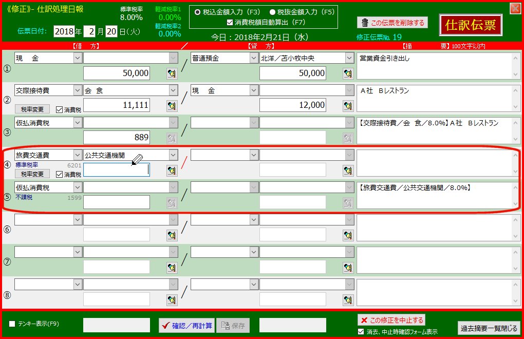 | 7. | 4行目借方で「旅費交通費」-「公共交通機関」と選択します | ||
