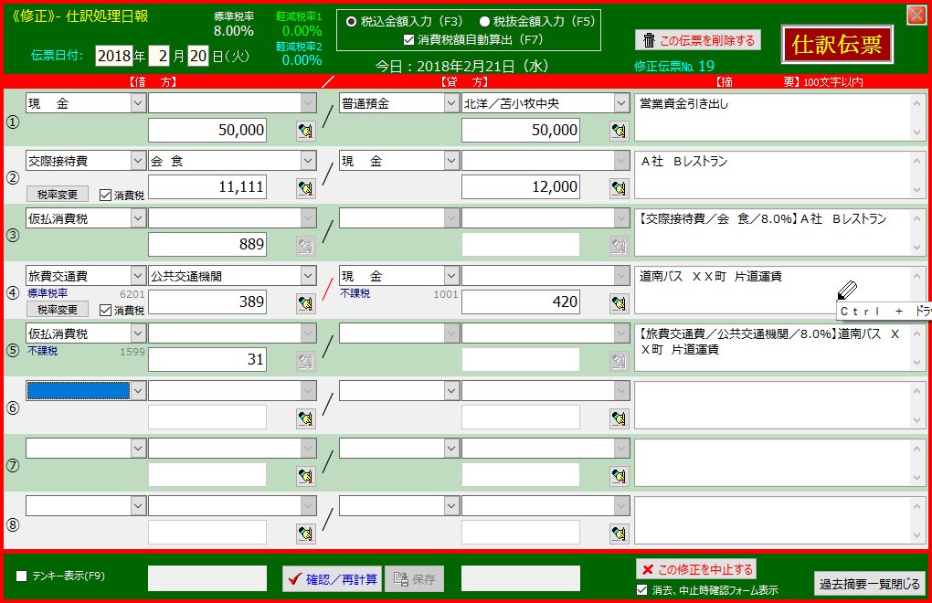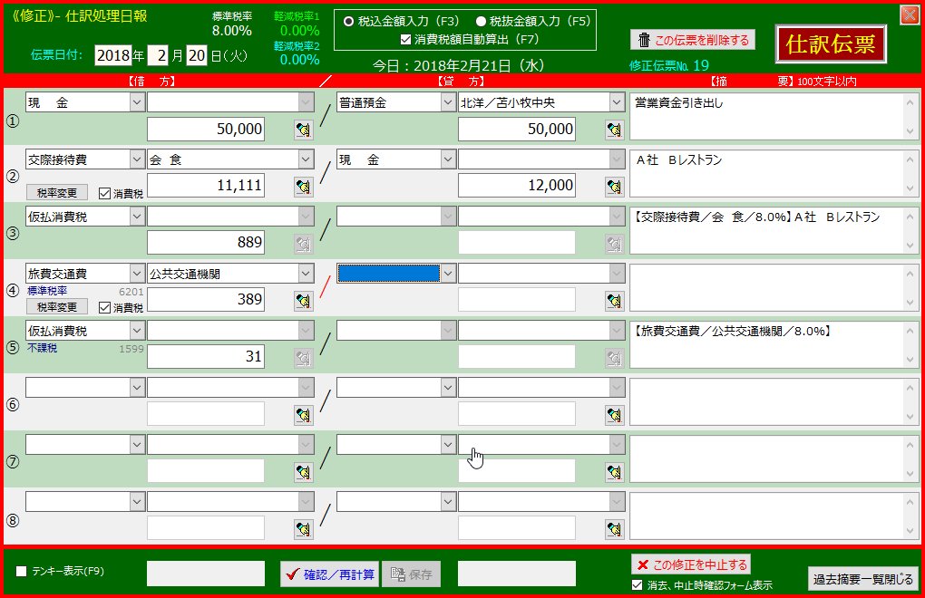 | 10. | 4行目摘要欄に適宜文を入力し「Enter」キーを押下します | 「Enter」キーを押下することで摘要文がその次の行の摘要欄に継ぎ足しコピーされます | |