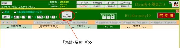 | 2. | 「集計/更新」ボタンをクリック | 基本的に精算表表示初期状態はメインメニューで選択されている会計期の「通期」状態です | |
