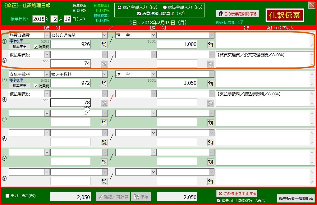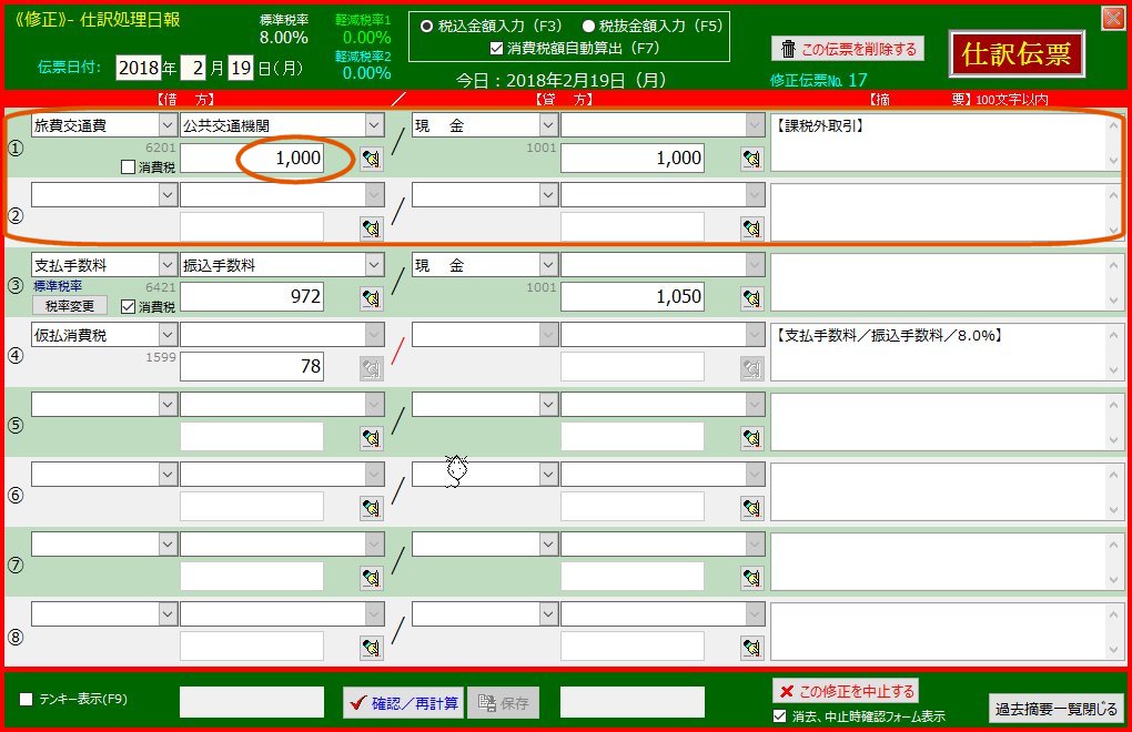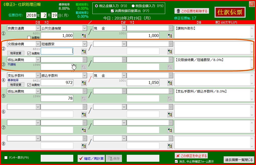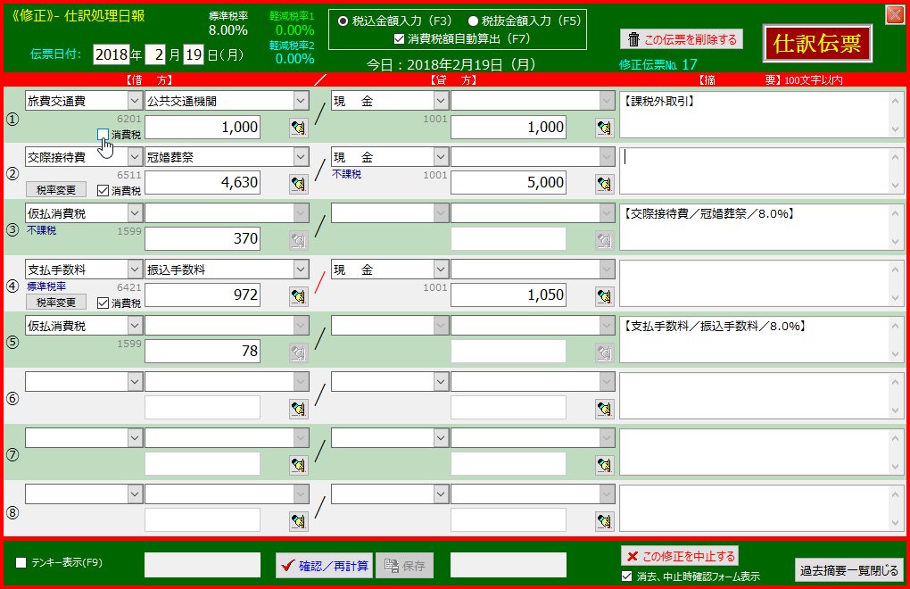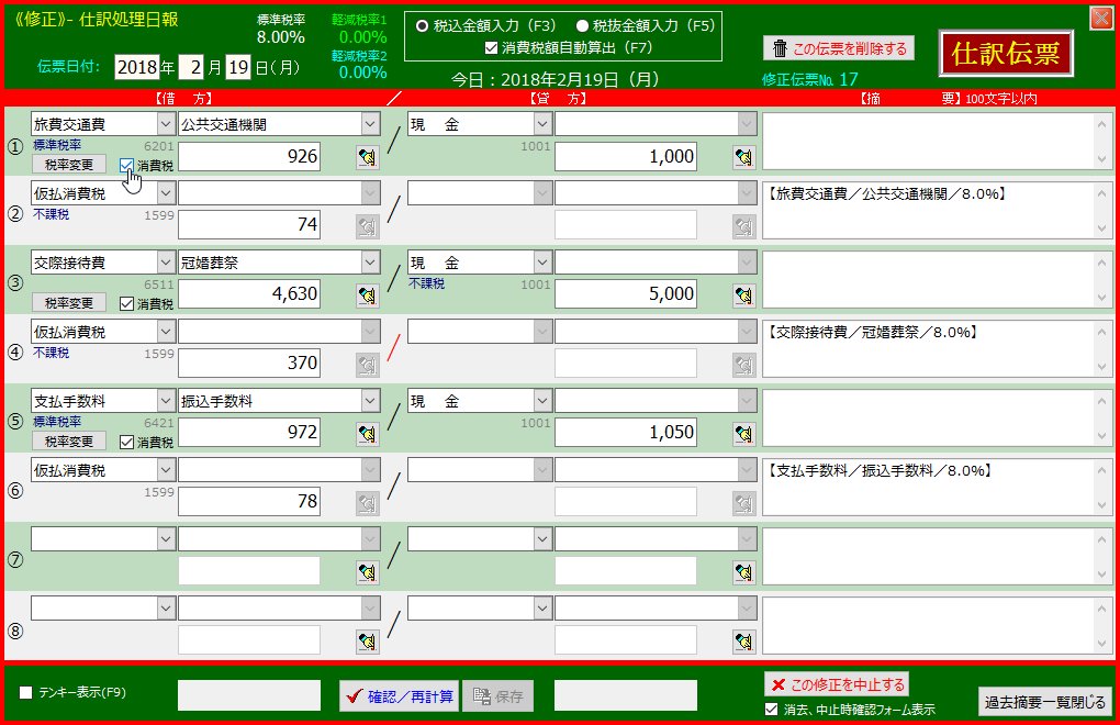 | 「確認/再計算」-「保存」ボタンを順次クリックして仕訳をデータベースに登録します | 「交際接待費」以下の行が下方にずれました | |