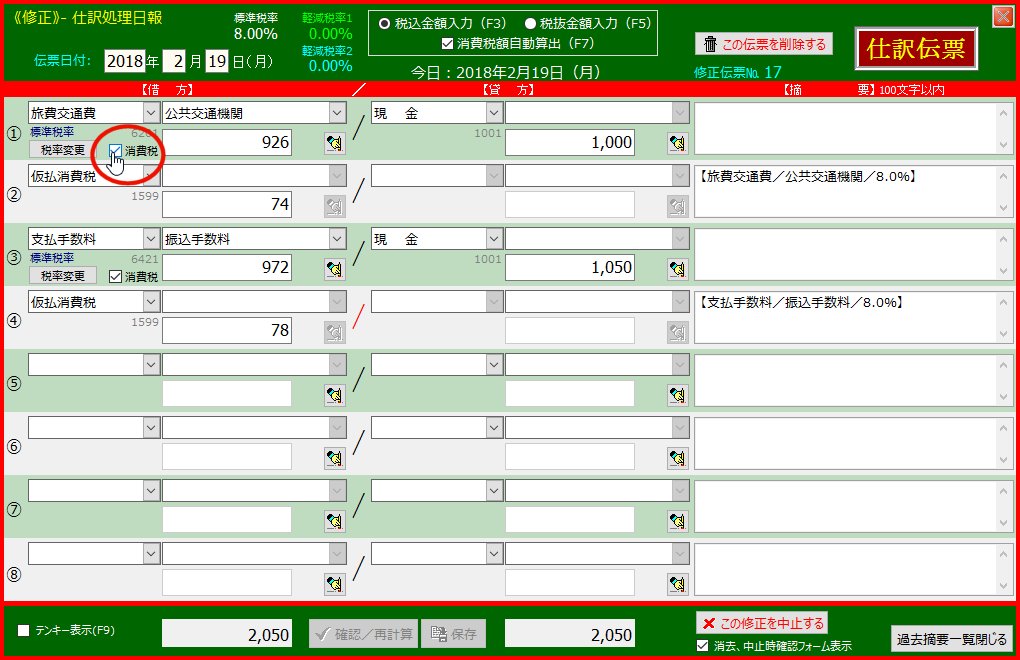 | 借方1行目の「消費税」チェックボックスをクリックします | チェックマークが戻り再び税抜き処理さます | |