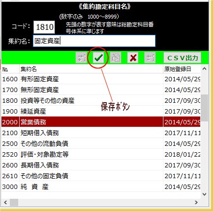 | 4. | 「集約名」入力ボックスに「固定資産」と入力「Enter」キーを押下し「保存」ボタンをクリックします | ||