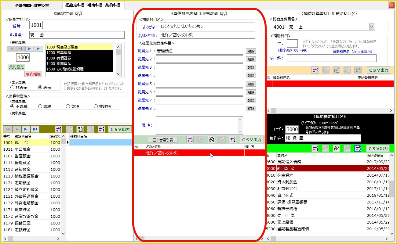 | 「北洋銀行苫小牧中央支店」を設けて「普通預金」「当座預金」「定期預金」「短期借入金」及び「長期借入金」勘定に関連付けてみます | ||||