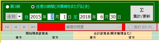 「任意の期間(決算期をまたがるとき)」ラジオボタンをクリックし 期間開始日をキーボードから「2015年7月1日」に変更入力し 「集計/更新」ボタンをクリック |