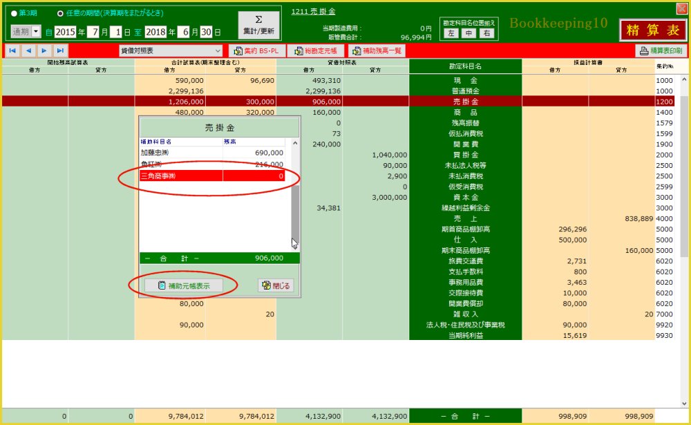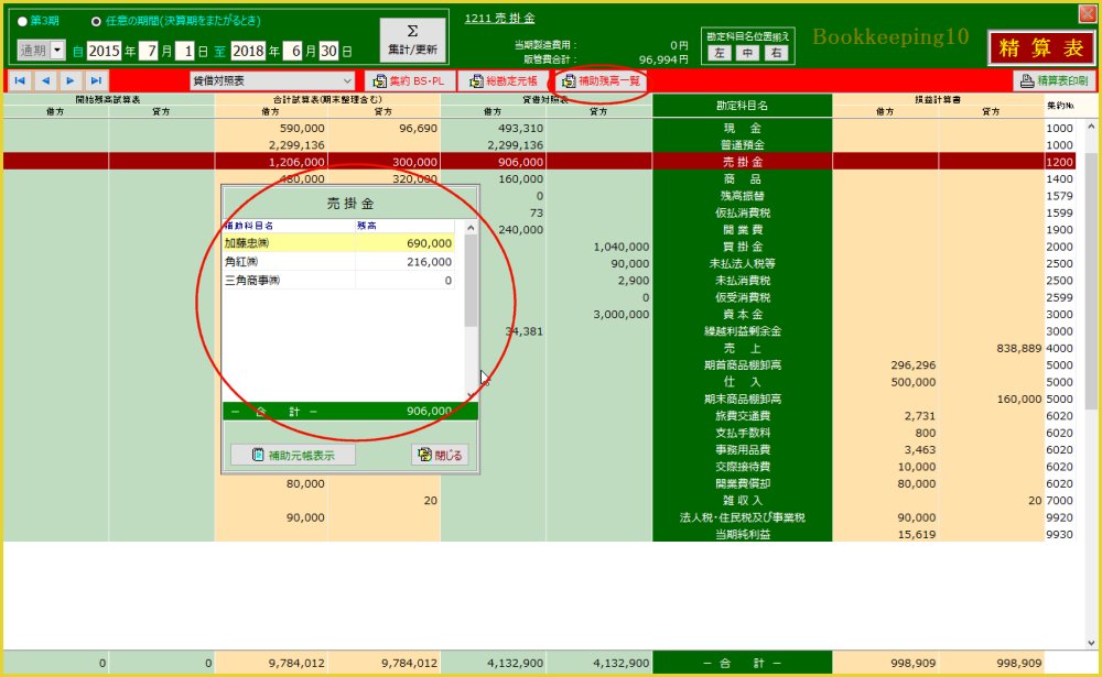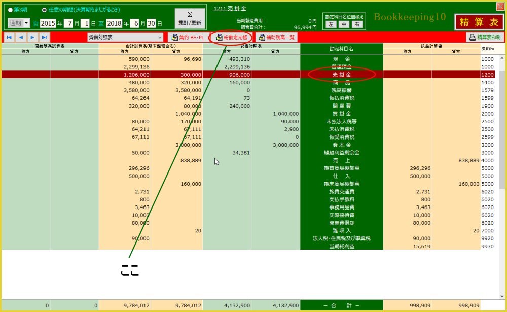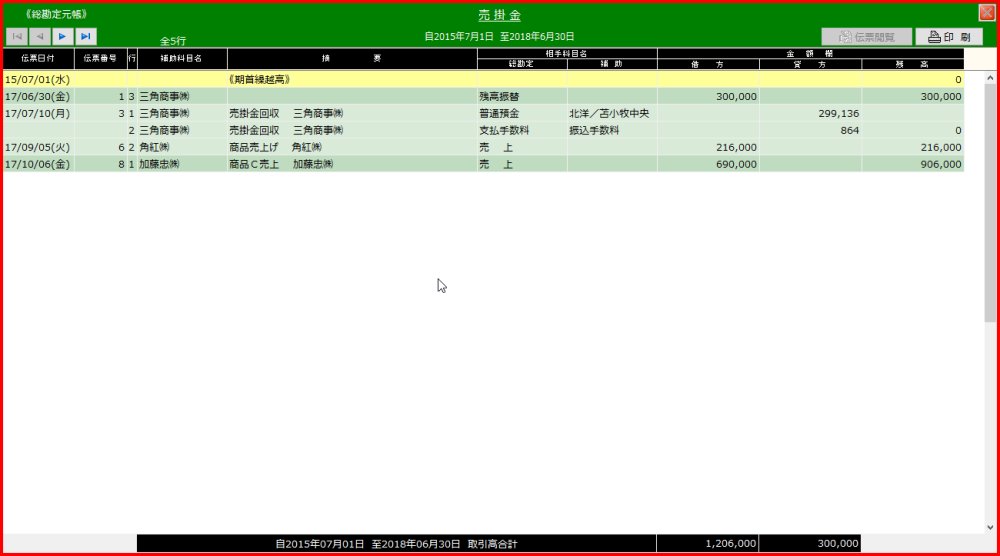 | 1. | 目的の総勘定科目を選択(この例では「売掛金」)した状態で