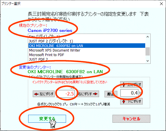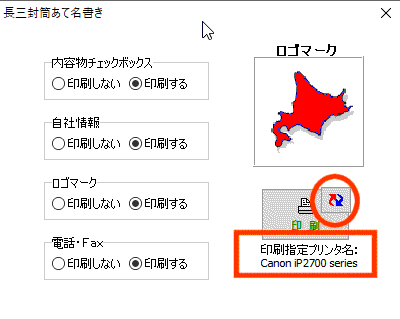 この例では本フォームを呼出した時点では「長三封筒宛名書き」用のプリンタとして「Canon iP2700 series」が指定されています |