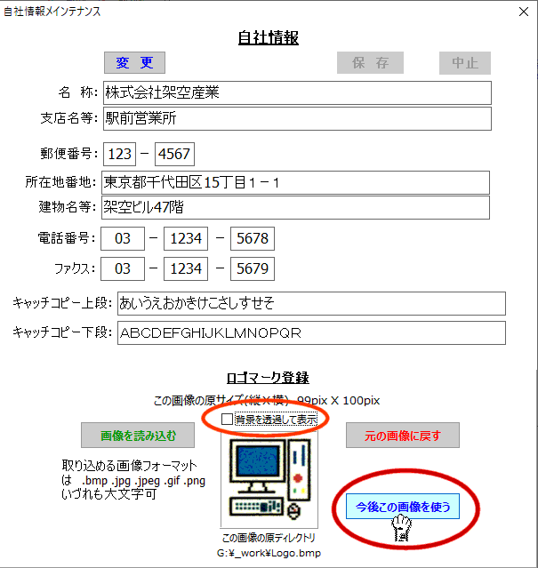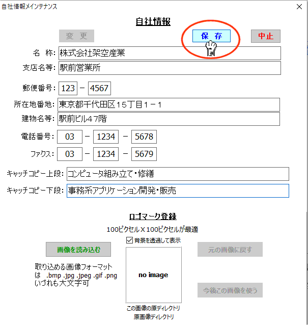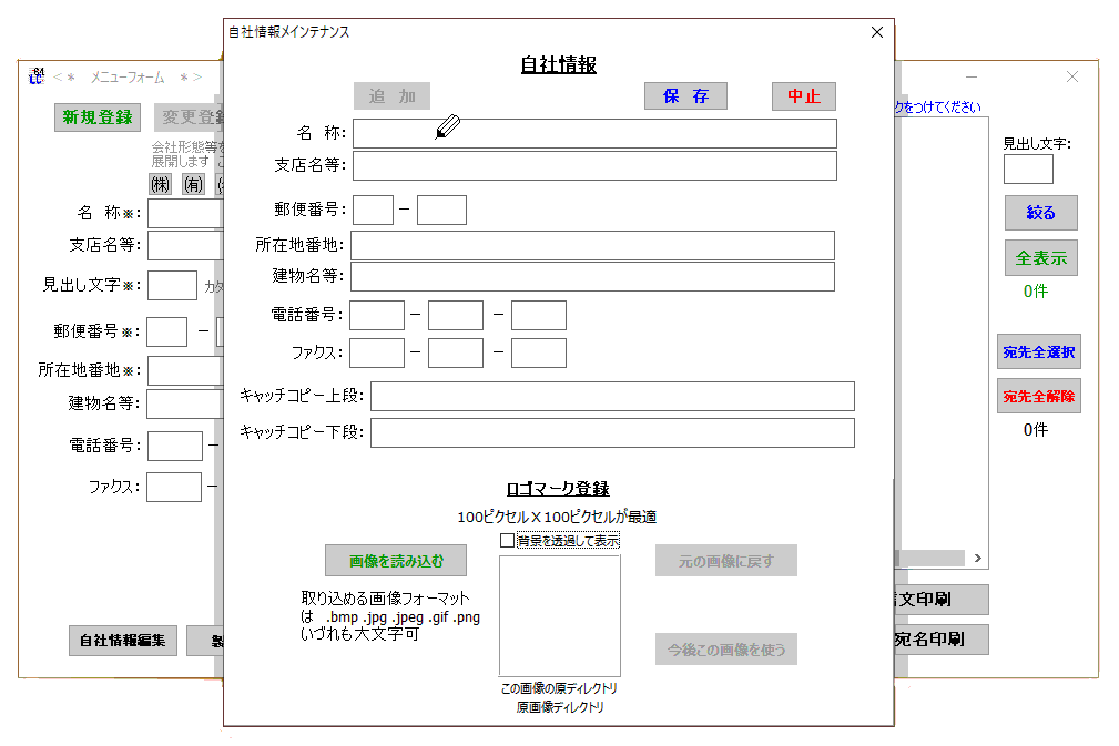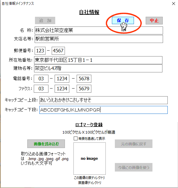 封筒や葉書きの宛名、通信文書印刷時に差出人として利用されます。(青枠内 青枠は印刷されません!念の為) なお、”ロゴマーク”を印刷するには別途ロゴマークの登録が必要です。 |