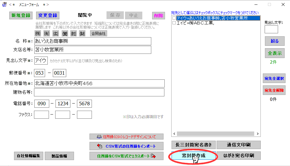メニューフォームで「窓封筒作成」ボタンをクリックします |