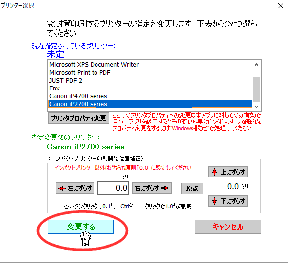 一覧からプリンタを選択して「変更する」ボタンをクリックします |