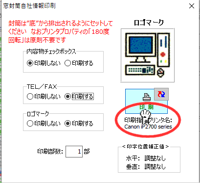 ロゴマークは「自社情報編集」で登録したそれです 封筒は「底」から排出される様にセットしてください(正しくは”プリンタの取扱説明書”に従ってください) なお、用紙サイズ(長三封筒)はアプリ側で自動設定します ※キャノンプリンタドライバでは用紙サイズプロパティを「長三封筒」に指定すると「底」から排出されるようになるようです すなわち「180度回転」指定は不要になります |