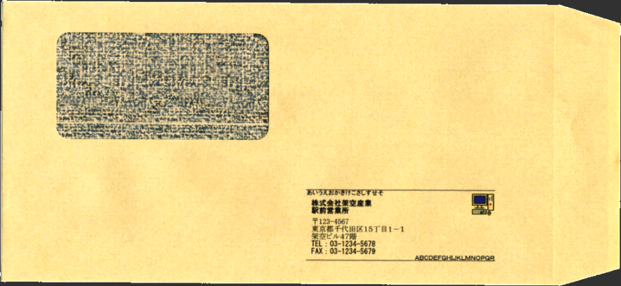 縦型長三窓封筒に自社情報を印刷します。宛名書きではありません。「通信文印刷」で作成した文書を封入します。 |