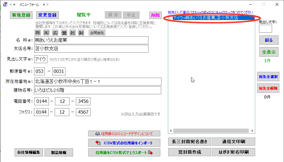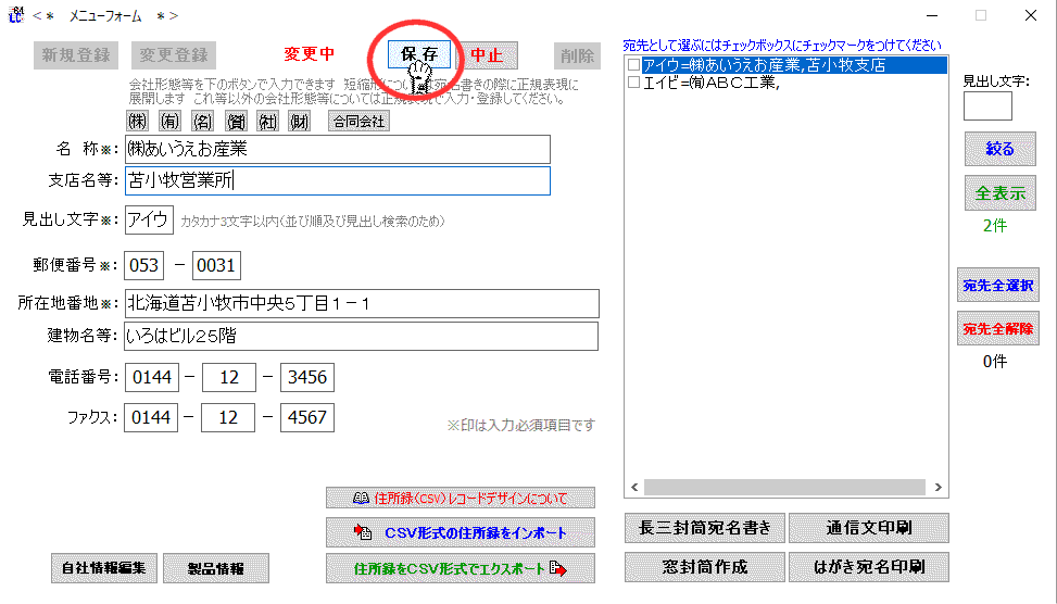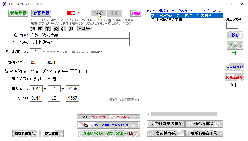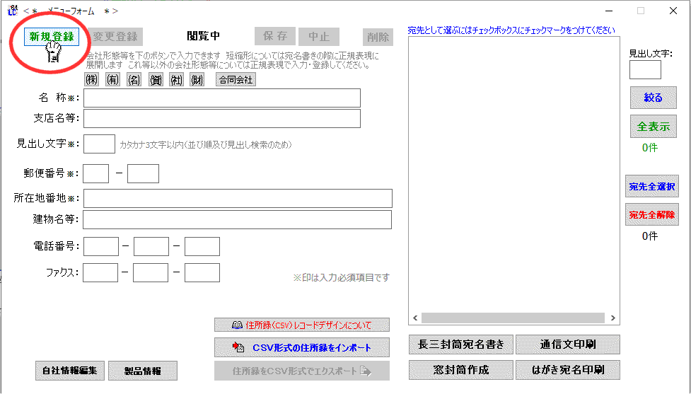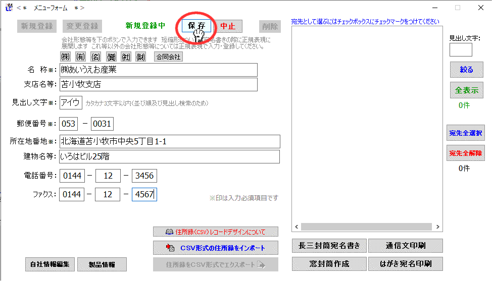 取引先(宛先)の所在地情報等を登録し住所録を作り上げて行きます。各種宛名書きに使います。 |