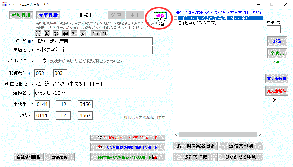 ”㈱あいうえお産業”を削除してみます |
