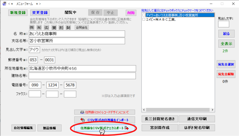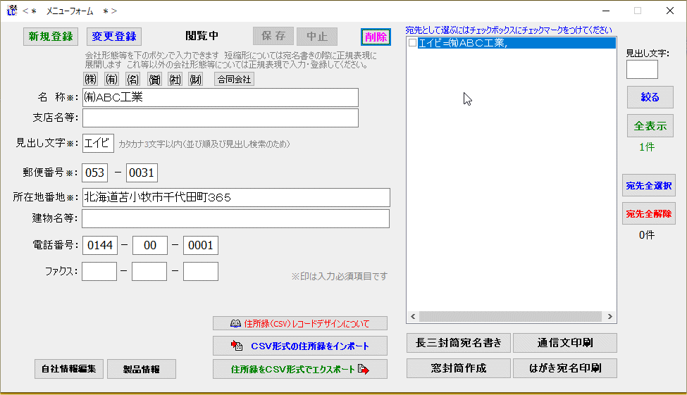 | ∮新規登録 ∮変更登録 ∮削除 ∮住所録エクスポート ∮住所録インポート |