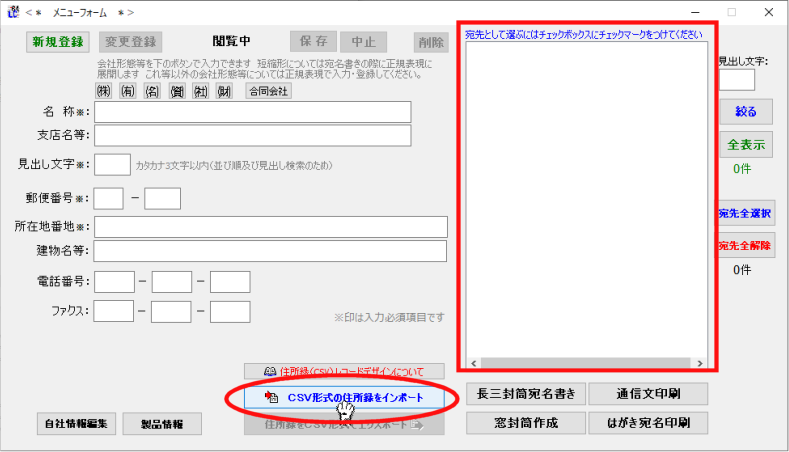 「CSV形式の住所録をインポート」ボタンをクリックします |