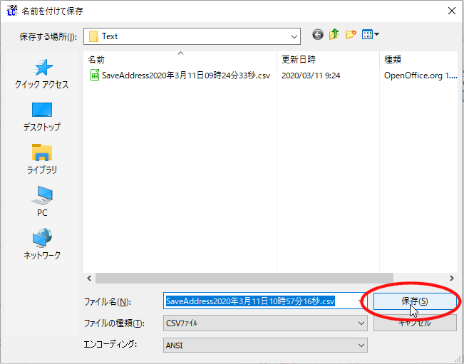 ファイル名が ”AddressBookyyyy年mm月dd日hh時mm分ss秒”として初期表示されますが、ご自身で分かりやすいように適宜変更してください CSV 形式ファイル(カンマ区切り)なので表計算ソフトで開くことができます、が文字エンコーディングをユニコード(UTF8)に指定して頂く必要があります |