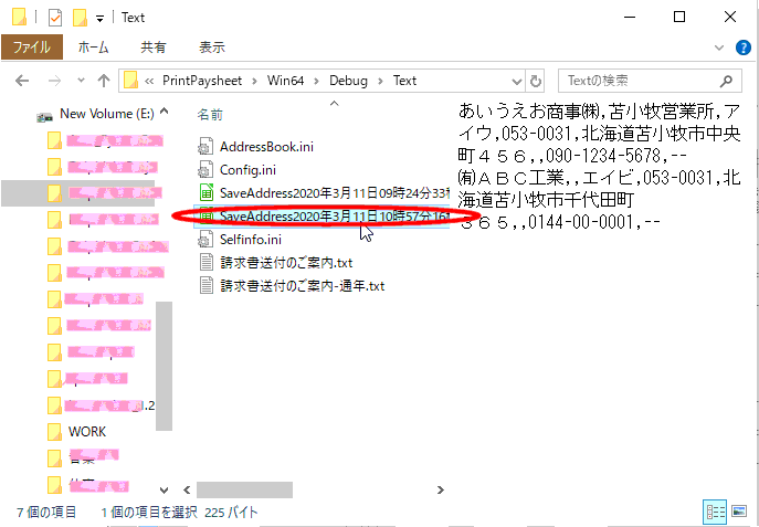 既定の保存先(フォルダ)は本アプリプログラム(PrintPaysheet_proj.exe)と同じ階層の”Text”フォルダです |
